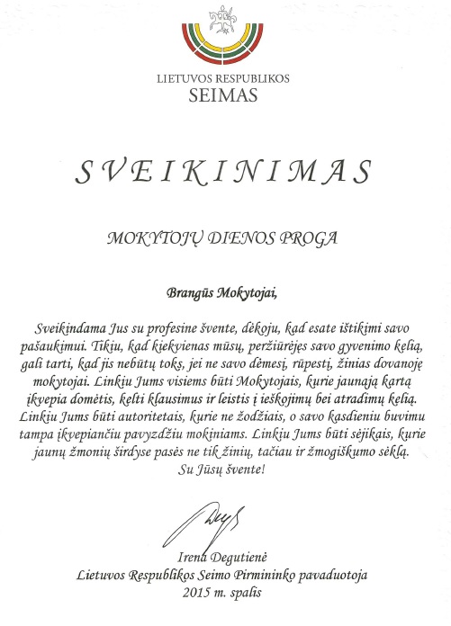Nuoširdžiai sveikiname Jus, brangieji, Tarptautinės mokytojo dienos proga ir siunčiame Lietuvos Respublikos švietimo ir mokslo ministrės Audronės Pitrėnienės bei Lietuvos Respublikos Seimo Pirmininkės Irenos Degutienės sveikinimus.