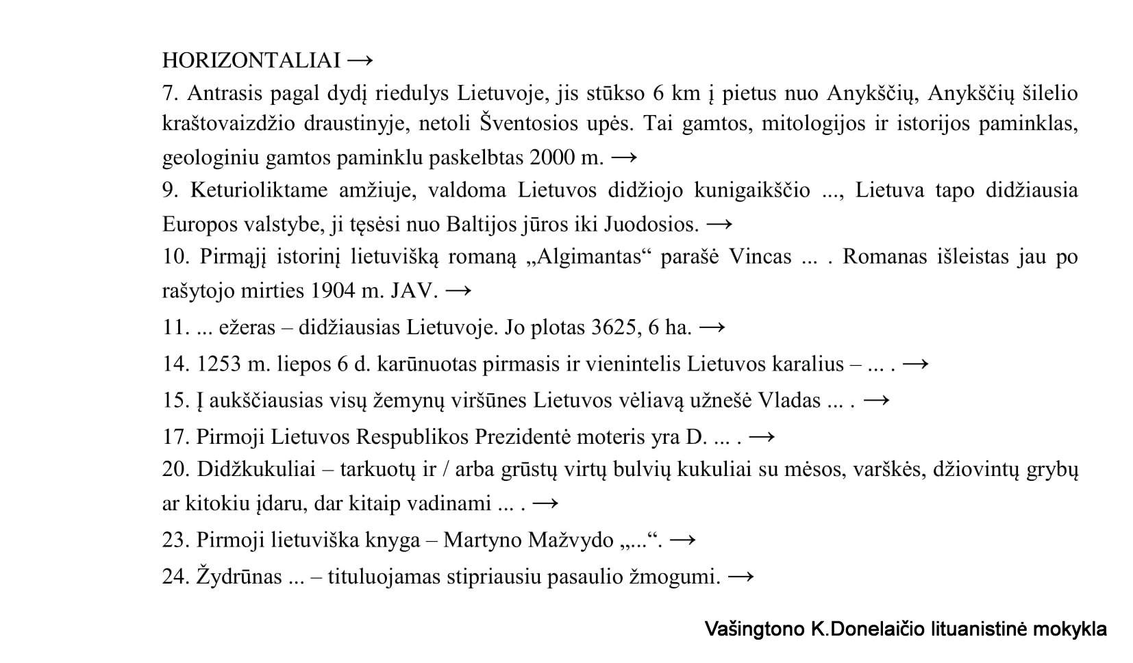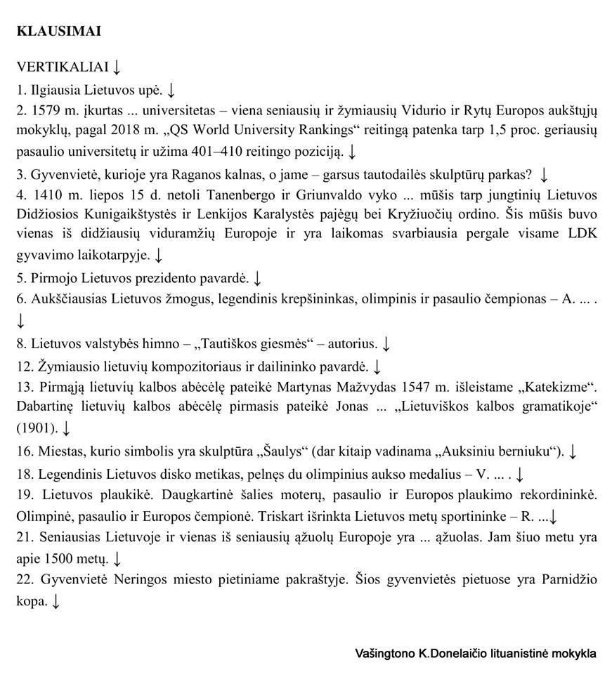 Šiandien pristatome 7 ir 8 klasių donelaičiukų paruoštą kryžiažodį apie Lietuvą. Kviečiame ne tik išspręsti šį kryžiažodį ir išsiaiškinti koks yra raktažodis, bet ir sukurti savo bei atsiųsti mums! Jūsų sukurtus kryžiažodžius siųskite mūsų mokyklos direktorei Jūratei direk@kdlmdc.org. Draugaukime! c32