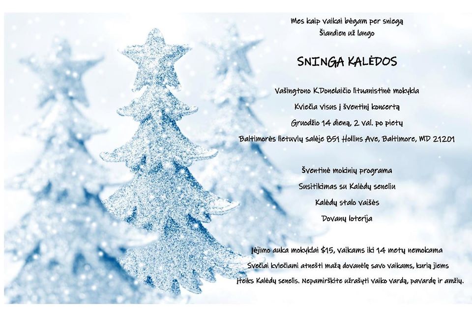Laukiame Jūsų gruodžio 14 d. 2 val. po pietų Baltimorės lietuvių salėje adresu 851 Hollins Street, Baltimore, MD 21201. Ateik!