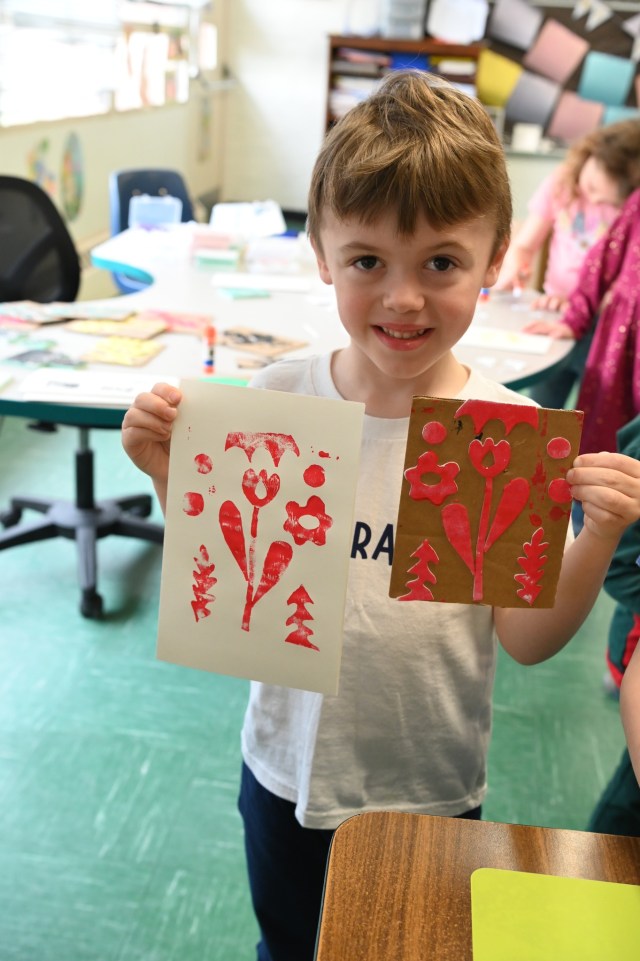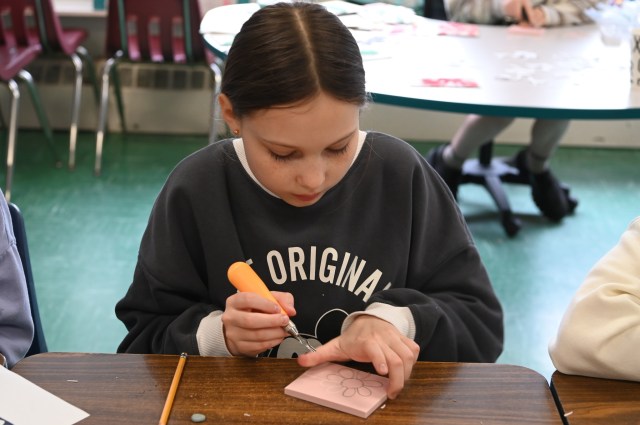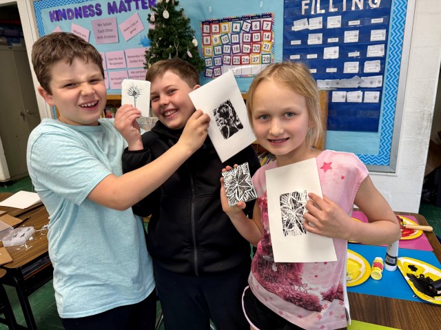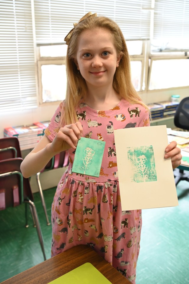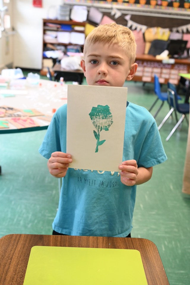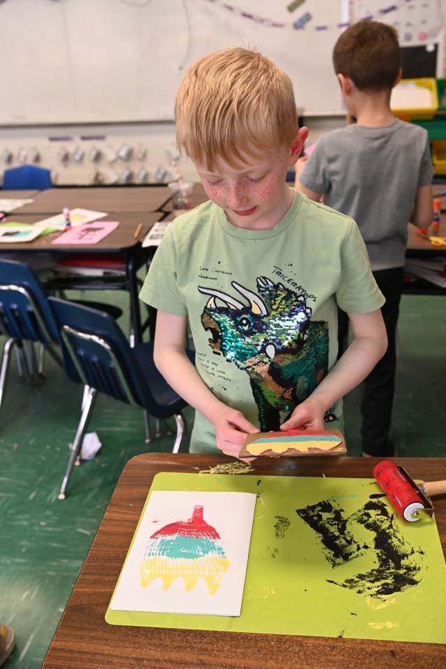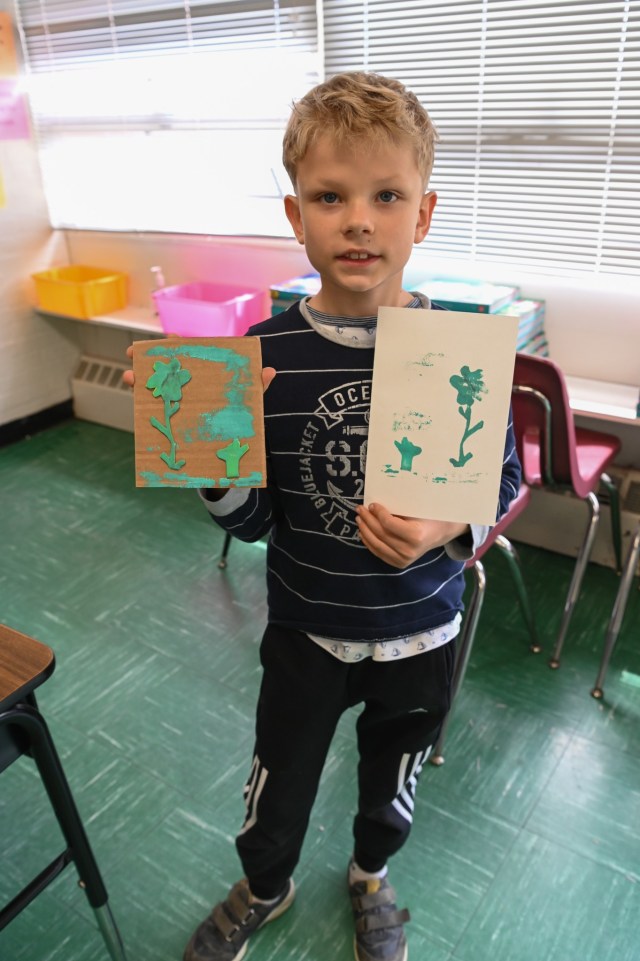 Mokinių ypatingai mėgstama mokytojos Lauros B. amatų pamoka. Šįkart karpomi ir raižomi gamtos motyvai, o iš jų daromi antspaudai. Rezultatas – ir gražus, ir originalus pačių pasidarytas paveikslėlis.