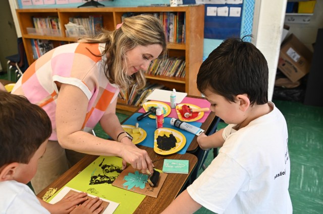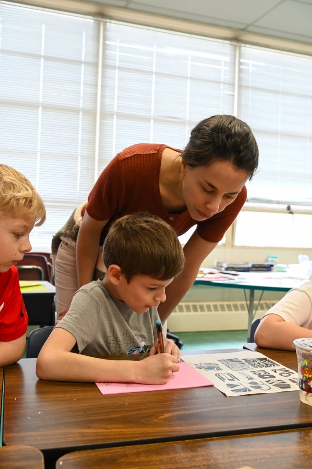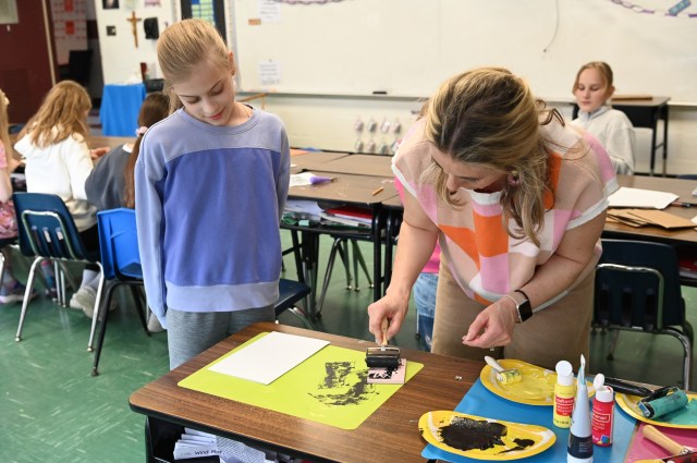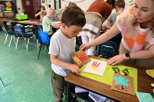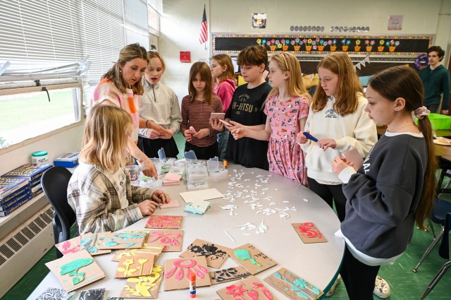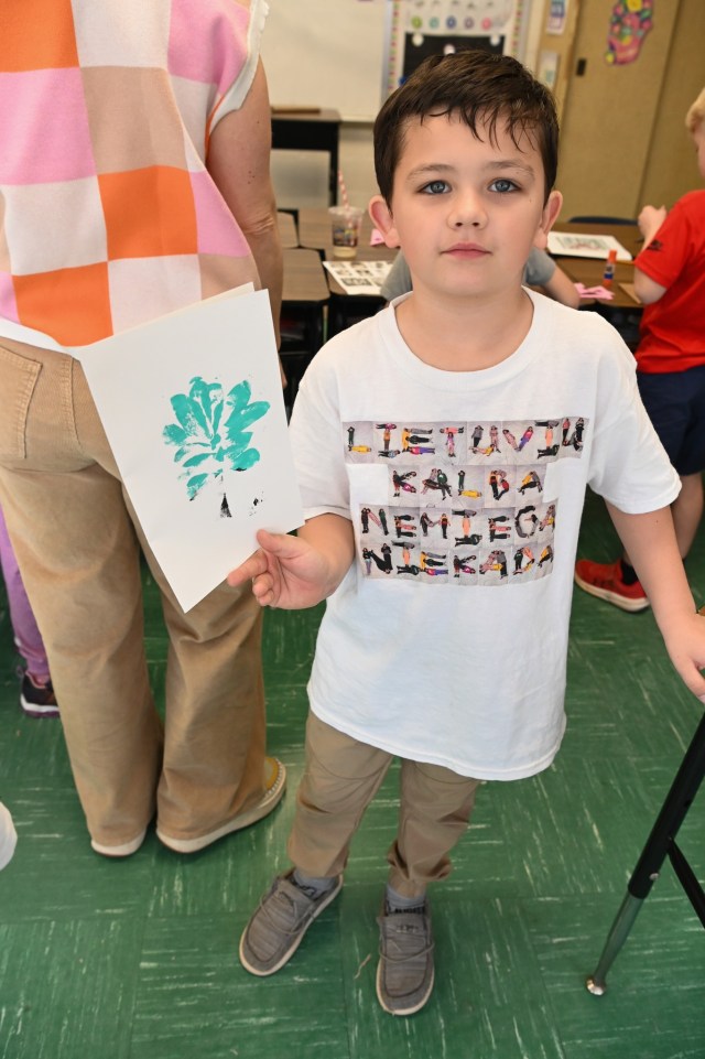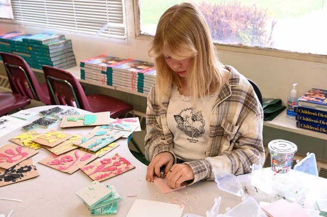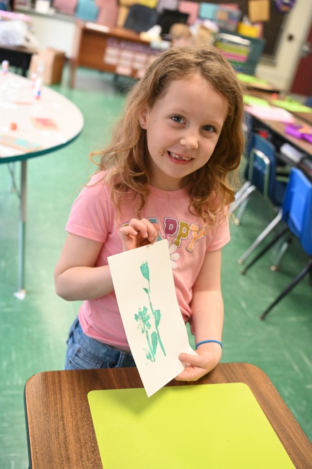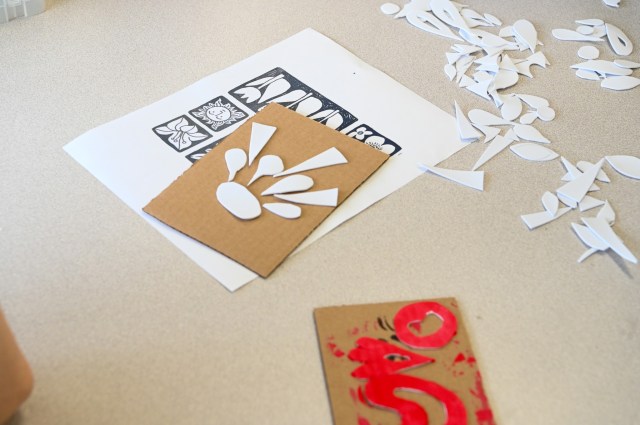 Mokinių ypatingai mėgstama mokytojos Lauros B. amatų pamoka. Šįkart karpomi ir raižomi gamtos motyvai, o iš jų daromi antspaudai. Rezultatas – ir gražus, ir originalus pačių pasidarytas paveikslėlis.