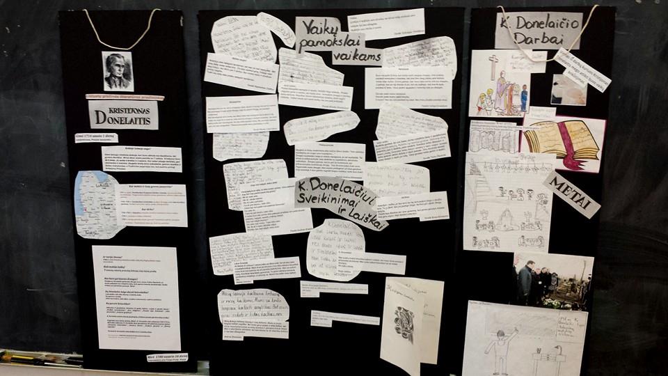 4 klasės mokiniai nuo sausio mėnesio, 300-ųjų gimimo metinių, mokėsi K. Donelaičio biografiją. Vaikai namuose skaitė ir klasėje pristatinėjo savo draugams rašytojo gyvenimą, rašė K. Donelaičiui sveikinimus ir laiškus, narginėjo kunigo darbus. Įdomiausias darbas buvo pamokslavimas- “mokyti visus kaip gyventi…“ (Regimantas). Projekto pabaigai visi mokiniai rašė pamoklus savo draugams.